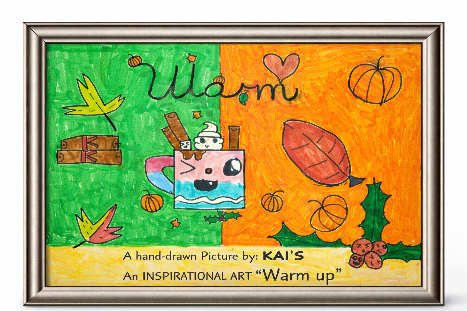 KAI’S “Warm Up” Art is a bright, fall-inspired piece created to bring comfort, joy, and motivation during the cooler autumn and winter months. With festive seasonal colors and playful warmth, this artwork is perfect for anyone who doesn’t enjoy the cold as much—but still wants to stay encouraged.
